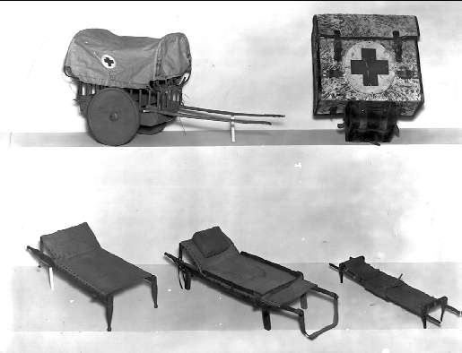 Trängen, sjukkärra från 1800-talets mitt, sjukvårdsränsel samt sjukbårar.