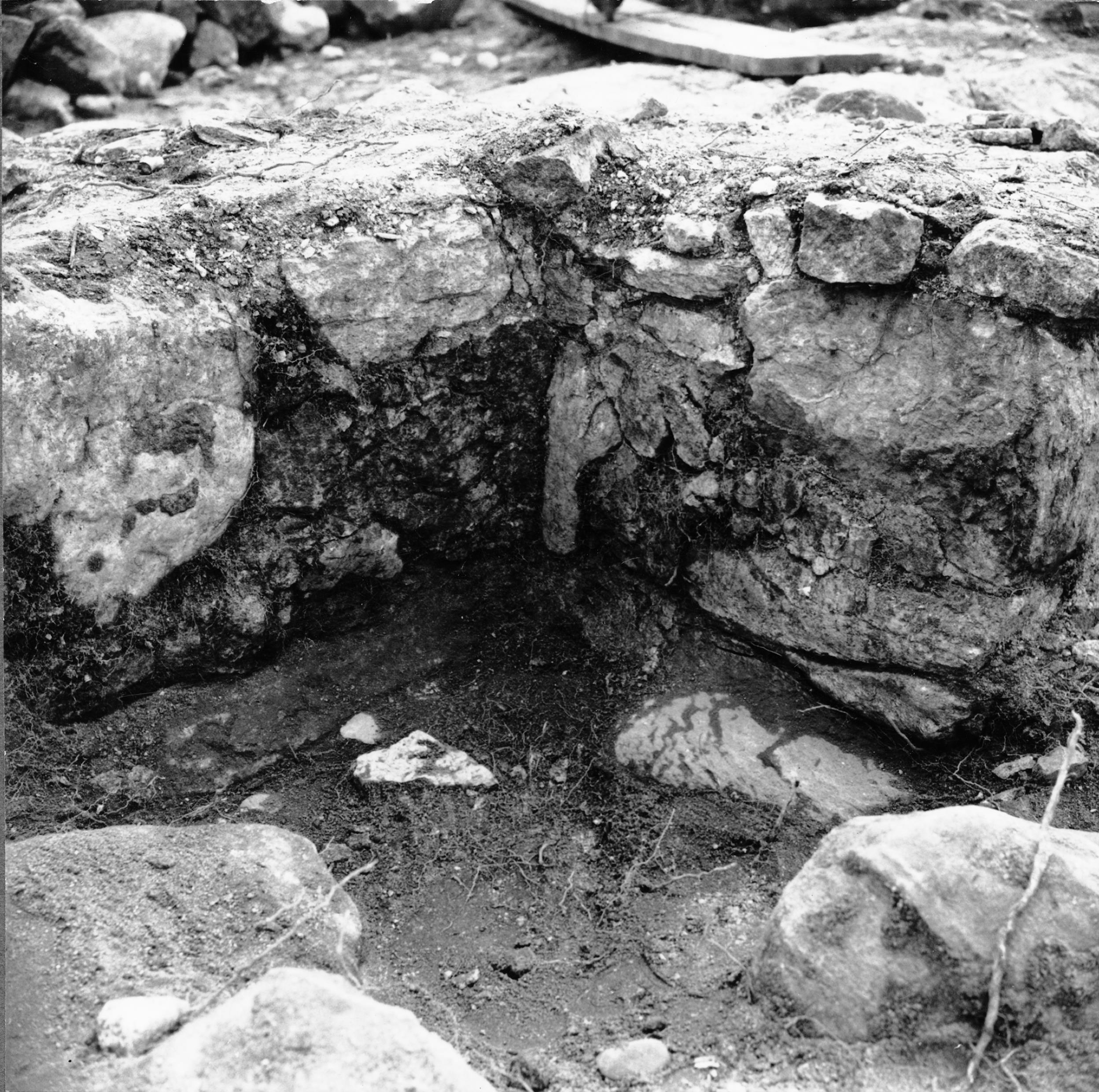 Kyrkoruinen, under undersökningen. Kvarsittande rester av puts i korets västra hörn.
