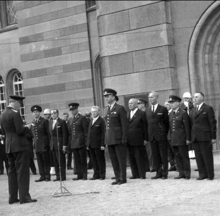Kungabesök i Karlsborg år 1962. Gustaf VI Adolf, Arne Pohl, Nils Lindgren, öv Bratt, Nils Johansson, R Leijon m.fl. På kyrkplan.
