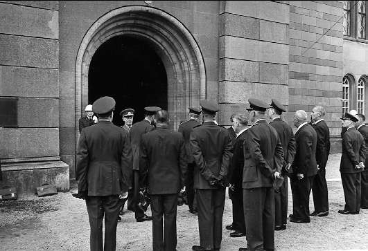 Kungabesök i Karlsborg år 1962. Gustaf VI Adolf hälsar på museikommittén.