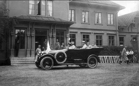 Gustaf V besöker Karlsborg 1914, mottagning på järnvägsstationen. Vykort.