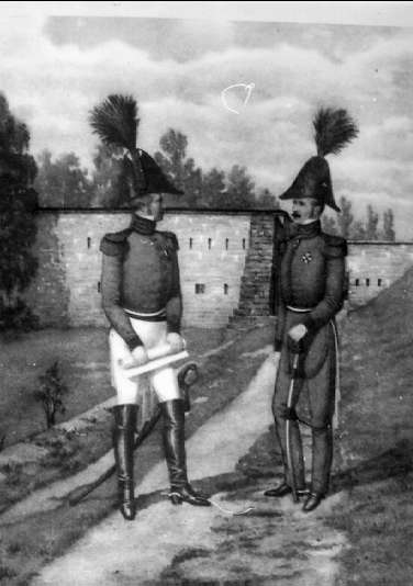 Ingenjörkårens fortifikationsbrigadsuniform m/1827. Akvarell av löjtnanten vid kungl. Fortifikationen O F Haverman. Finns förstorat 23 x 16 cm. Neg. finns.