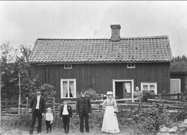 Tidtypisk stuga omkr år 1900. Personer och plats okända. Förstoring 37 x 53 cm. Neg finns.