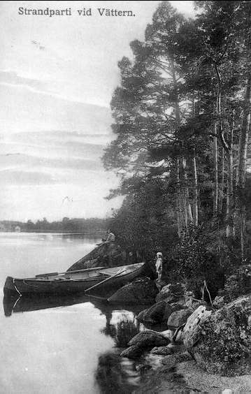 Strandparti från Vättern, år 1910. Foto: A Sjöberg. Förstoring 55 x 35 cm.