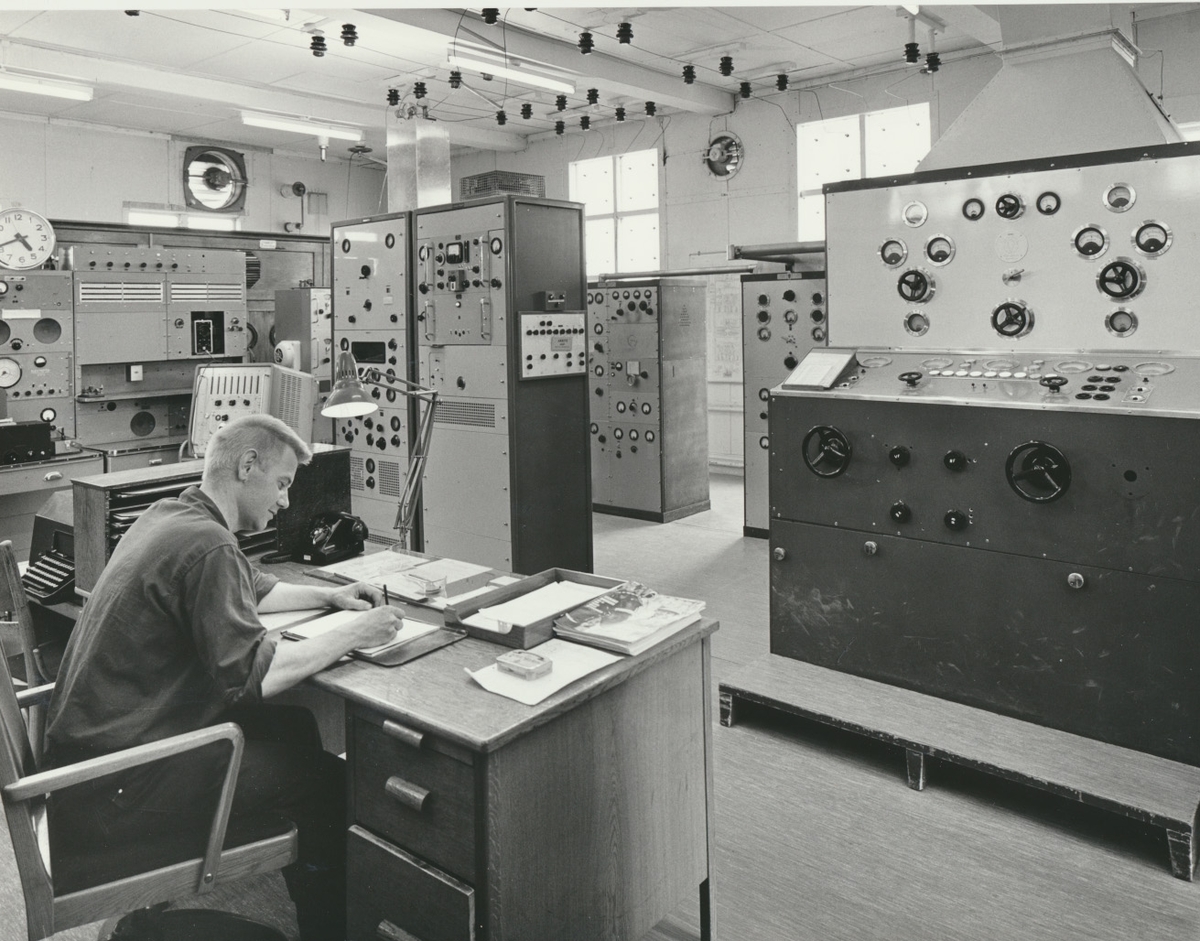 Kråks radiostation Karlsborg 1964. Kortvågssalen gamla station. Sändarvakt: Sture Gunnarsson.