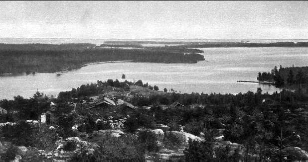 Mölltorp, utsikt Vaberget mot Karlsborg. Vid horisonten syns fästningen. Neg finns.