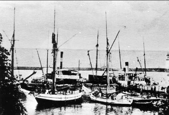 Skutor och passagerarbåtar, Svanen, Måsen, Diamanten, Trafik, Freja och Slottsbron i Hjo hamn.