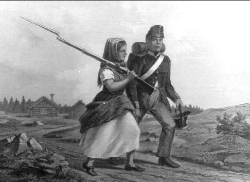 Tecknad skildring ur indelta soldatens liv. Soldaten på väg till regementsmötet. Förstoring 17 x 23 cm finns. Neg finns.