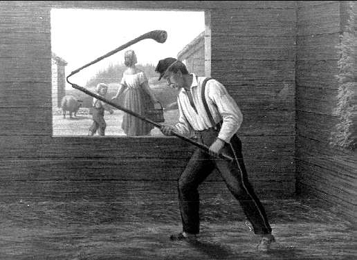 Tecknad skildring ur indelta soldatens liv. Hemma på roten. Förstoring 17 x 23 cm finns.