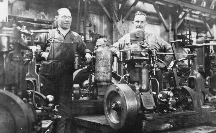 Interiör Forsviks bruk AB motorverkstad, omkr 1914. Till vänster Paul Jonsson och till höger Sten Vikström.