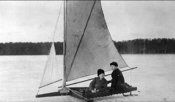 Karlsborg, isjakt på Bottensjön omkr 1932, Harry Liljegren (till vänster) och Becker. Förstoring 28 x 40 cm. Neg finns.