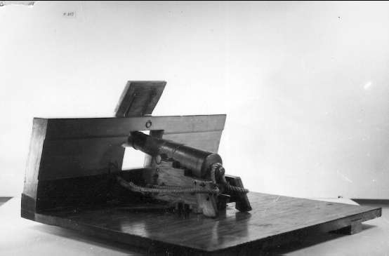 Titel: Kanonmodell, styckelåda modell av trä, beslagen med kanon av järn, 24-pundig. Kapten Malmstens modell. Marinmuseet.