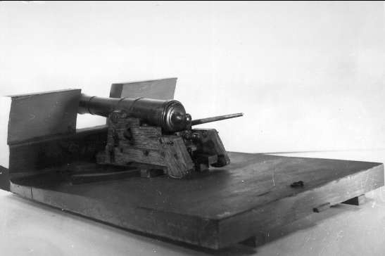 Kanonmodell, 36-pundig kursör - svänglåda av Malmstens modell, med kanon. Marinmuseet.