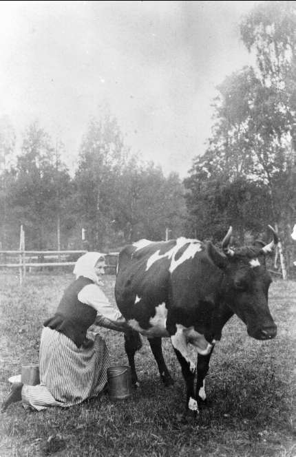 Forsvik, Billströmmen, Augusta Persdotter mjölkar svarta - Maja omkr år 1910. Förstoring 34 x 30 cm. Neg finns.
