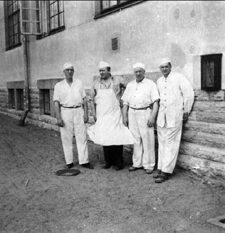 Fästningen, bagare anställda på kronobageriet (beläget vid Havremagasinet, byggår 1911-12), till höger Petter Flood. Neg finns.