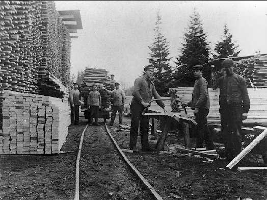 Sågen i Granvik, arbetare i verksamhet. Förstoring 30 x 40 cm.