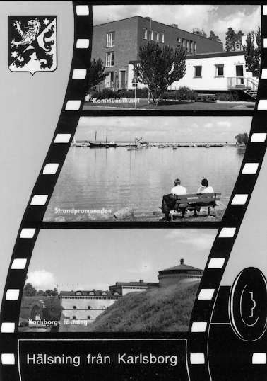 Karlsborg, motiv av kommunalhuset, strandpromenaden och fästningen. Vykort.