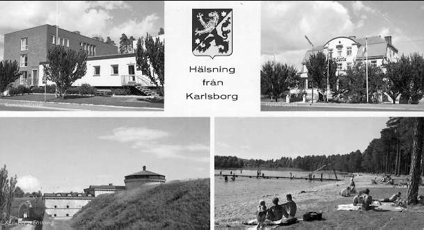 Karlsborg, motiv av kommunalhuset, hotell Gästis, fästningen och badplats vid Bottensjön. Vykort.