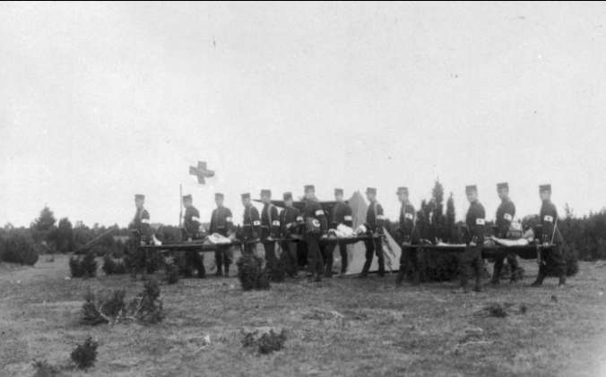 Sjukvårdsövning i Karlsborg omkr år 1900. Förstoring 30 x 50 cm.