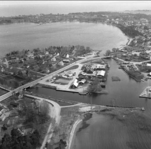 Karlsborg, Kanalholmen. Flygfoto. Göta kanal, strömmen, Rödesund samt Karlsborgsviken med Fästningen i bakgrunden. Endast neg finns.