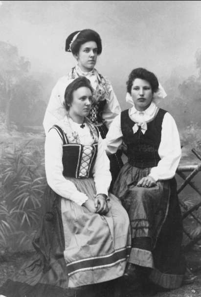 Undenäs, Mia och Hedvig Jansson samt Elsa Bergqvist iklädda foldräkter. Förstoring 37 x 53 cm. Endast neg finns.
