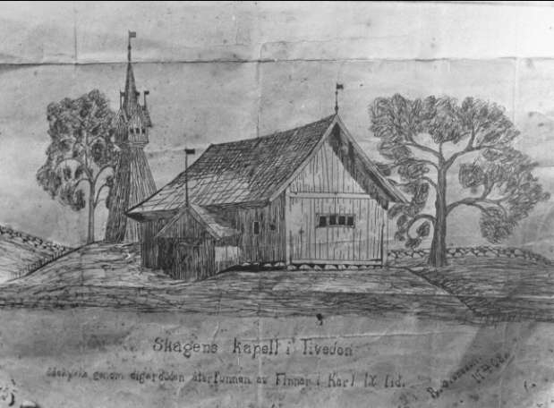 Undenäs, Skagens kapell i Tiveden. Teckning av R Svensson 13/2 1908. Förstoring 29 x 40 cm. Neg finns.