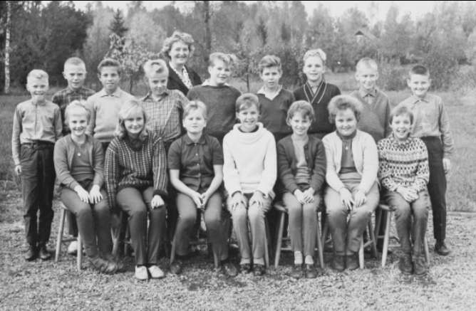 Svanvik, Perstorps skola. Skolklass med lärare Gerd Holzmann. Förstoring 26 x 39 cm. Neg finns.