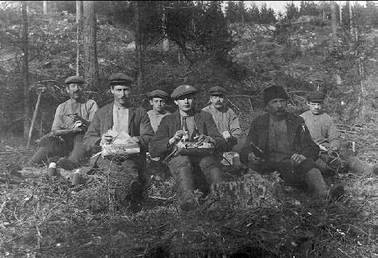 Granvik, ett arbetslag skogsröjare, matrast på "hygget". Neg finns.