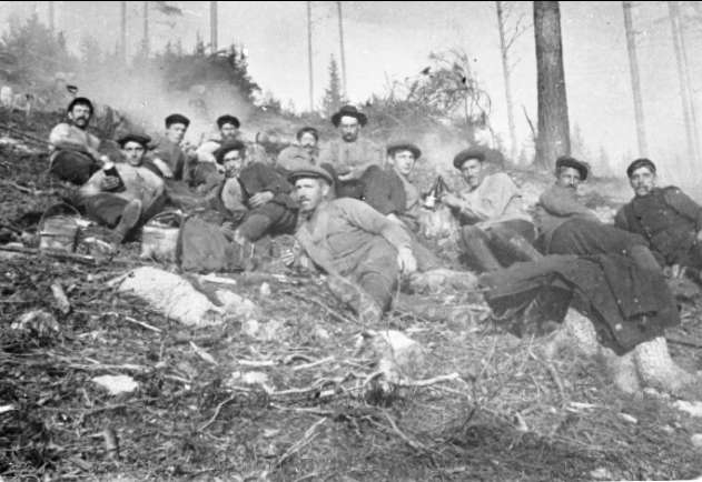 Granvik, ett arbetslag skogsröjare, matrast på "hygget". Endast neg finns.