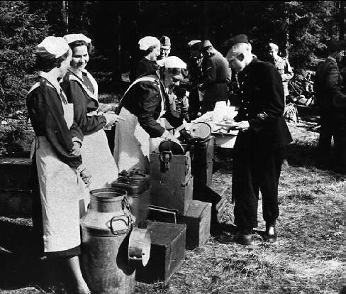 Förplägnadstjänst för lottor vid 3:e milots orientering i Sandhem i början av 1950-talet. Fotot finns i plastad samlingspärm - S L K 1934 - 1976. (pärmen finns under inv nr 53952). Förstoring 31 x 36,5 cm. Neg finns.
