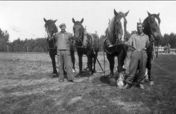 Sörgården Svanvik, till höger Olle Kindbom tillsammans med arbetshästar.