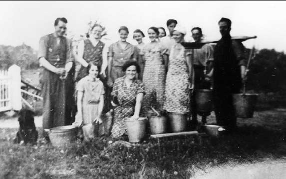 Arbetslag, kvinnor och män med hinkar och baljor.