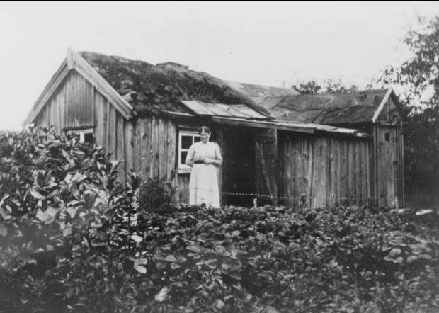 Karlsborg Gräshult. Torpstuga med okänd kvinna framför byggnaden. Endast neg finns.