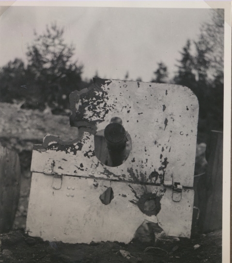 Ammunitionsfabriken i Karlsborg 1920-tal. Kulsprutesköld träffad av en 20 mm spränggranat.
