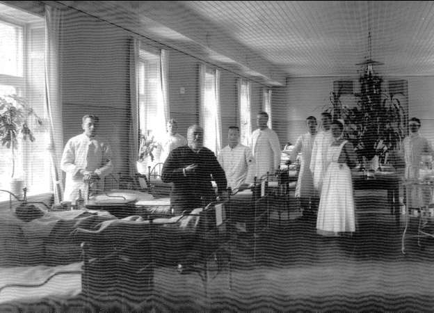 Fästningen, interiör av garnisonssjukhuset med personal och patienter. Förstoring finns utställt på museet. Förstoring 17 x 23 cm.