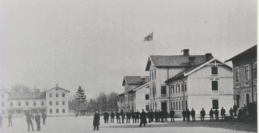 Karlsborg. Infanterivolontärskolan , senare rekrytskolan för infanteriets officers-och reservofficersaspiranter. Slutet 1800-tal. Till vänster: Befälsbyggnaden Till höger :Östra kasern, Mittenkasern, del av västra kasern. Rums-funktioner:se arkivet.