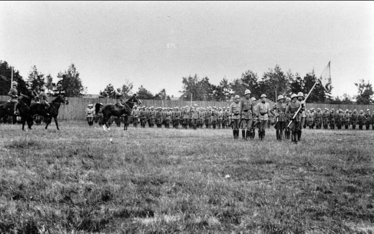 Titel: Karlsborg. Uppställning med ryttare och fana på heden.