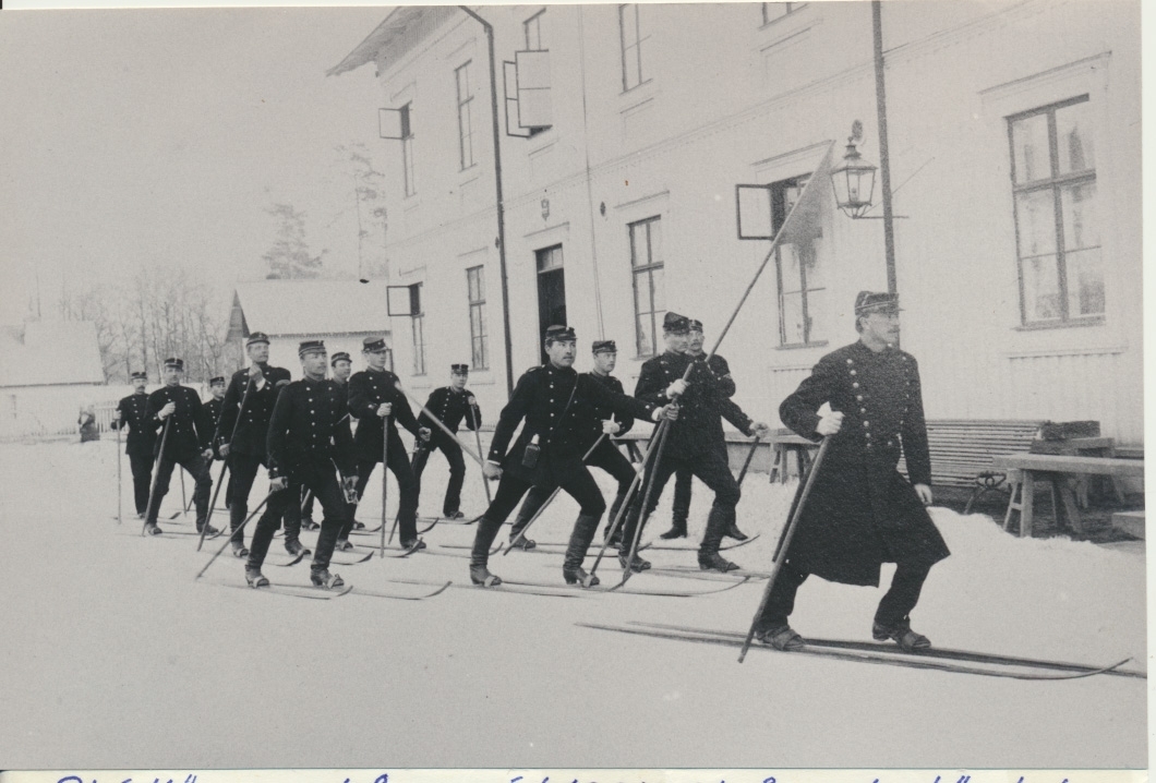 Karlsborg. Infanterivolontärskolan , senare rekrytskolan för infanteriets officers-och reservofficersaspiranter. Mitten 1880-tal. Skidlöpare-kåren vid volontärskolan. Byggnaden till höger: Östra kasern.