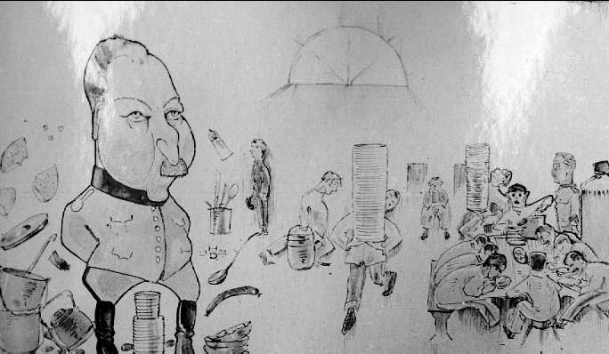 Karikatyrteckning föreställande kökföreståndare Serg Stillert.