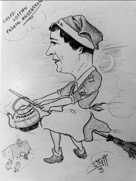 Karikatyrteckning förställande chefslottan fröken Andersson.