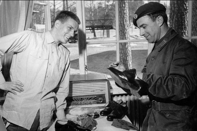Karlsborg FJS. Rustmästare Thore Samuelsson visar hur man bör putsa skor.