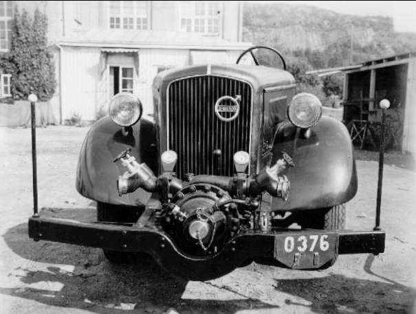 Garnisonsbrandkårens brandbil av äldre årgång.