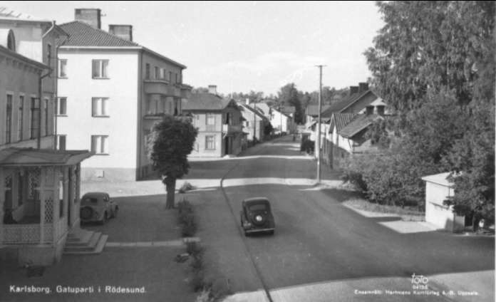 Karlsborg, Storgatan. Närmast till vänster Palmqvistska huset sedan landfiskalhuset som i dag är hyresfastighet. Endast neg finns.