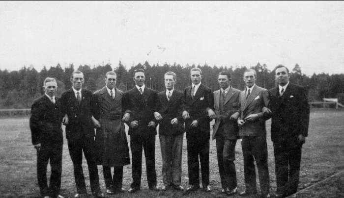 Karlsborg, från vänster mj Bjerke, Erik Stohlbin, okänd, Oskar Rosenqvist, okänd, Holger Edholm, Gösta Johansson, Tage Andersson och Gösta Hedenberg. Gåva från Rickard Leijons Sterbhus.