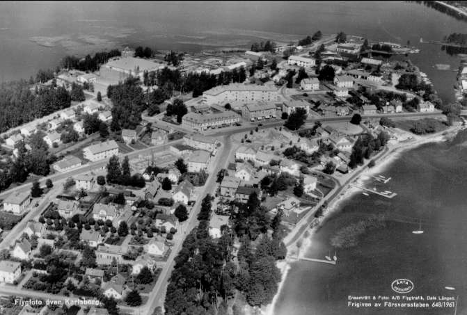 Flygfoto över delar av Karlsborg med stora hotellet i centrum, del av Strömbron och varvsområdet. Kortet är från K-A Hanssons album.
