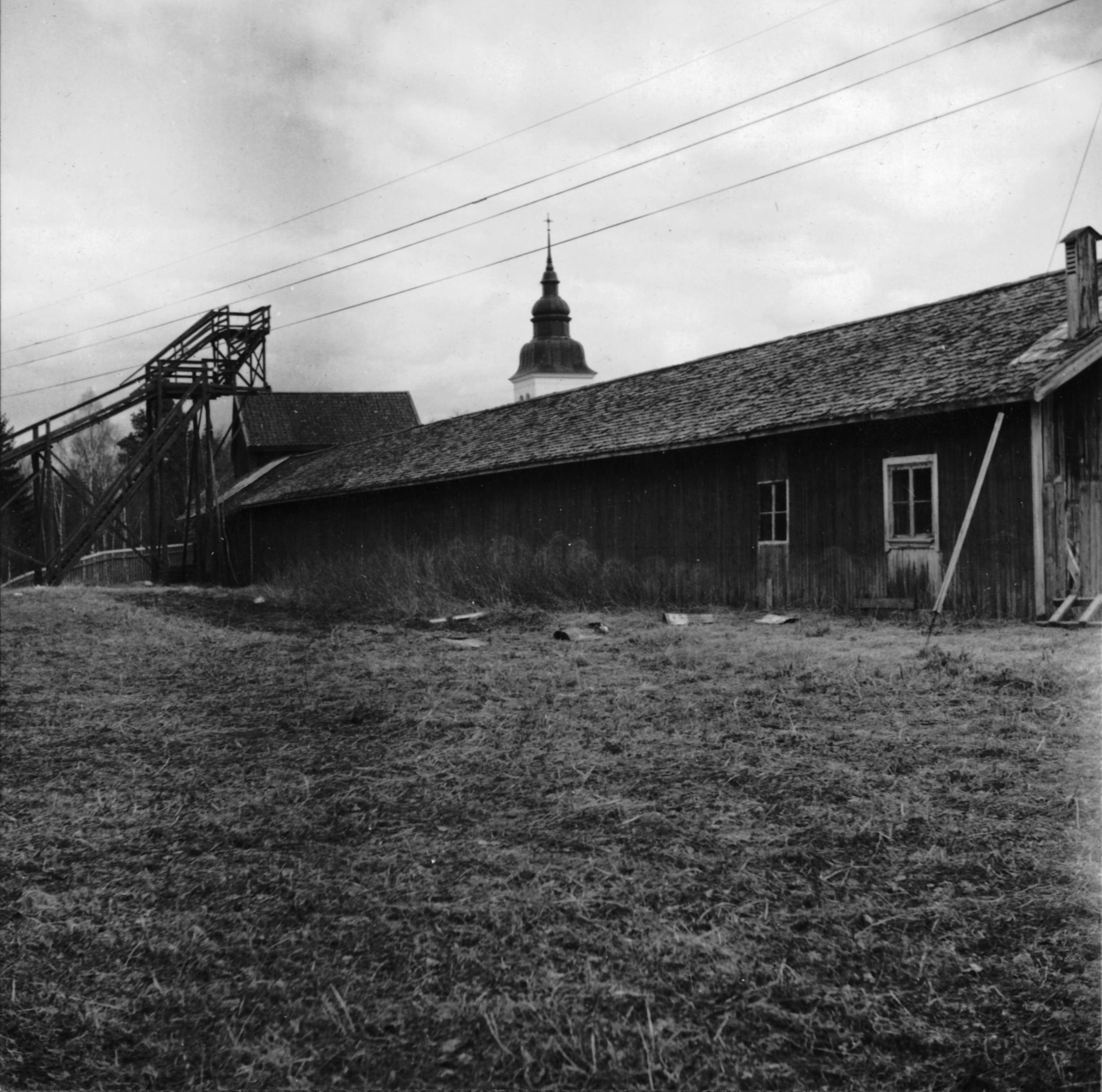 Uthuslänga, sockenmagasin och hopptorn till skidbacke vid kyrkan. Från nordväst.