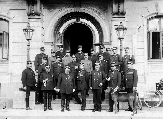 Gruppbild på officerare utanför officersmässen, fästningen, Karlsborg.