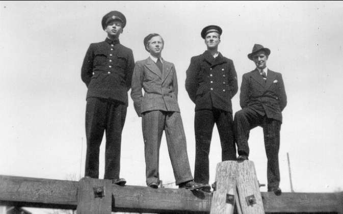 Karlsborg, Rödesund vid kanalen. Från vänster Rosendahl, Sandén, Adamsson och skräck (Sindvik). Kortet tillhör Karl-Axel Hanssons album.