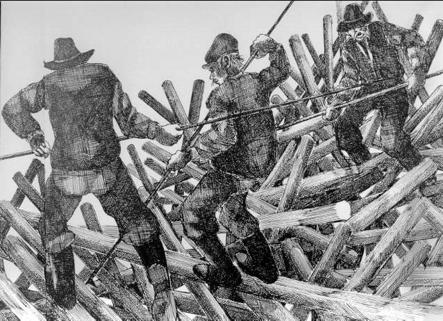 Utställningen "Skogsbruket förr och nu" år 1984-85. Timmerflottning. Avkopierade bilder från böcker.
