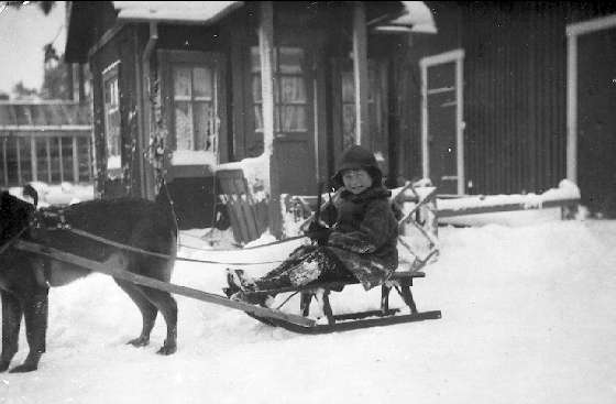 Karlsborg, storgatan. Ebbe Gunnarsson med hunden Russo, år 1929.